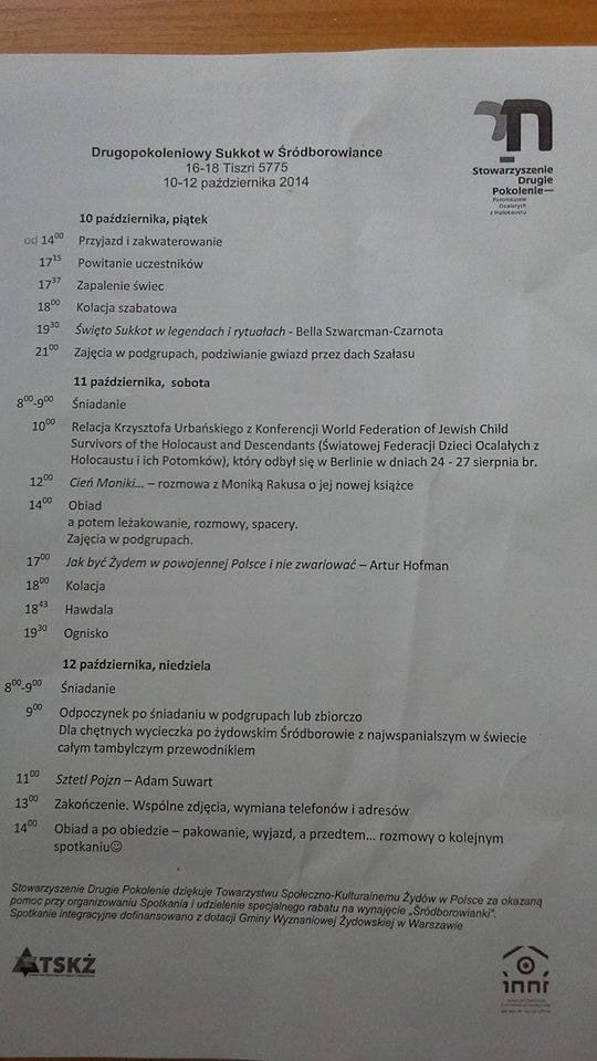 Bylo wspaniale ! Tylko troche za krotko zeby sie ze wszystkimi poznac i nagadac od serca. Sukka przepiekna, jedzenie jak u zydowskiej mame, Program super ciekawy, slonce i jesienne kolory cudowne i az sie cieplo na duszy robilo od tych serdecznych spotkan. A w bonusie spiewy po hebrajsku ! Srodborow ma magiczny czar ! Dziekuje za to wszystko !