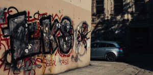 Wystarczy zasłonić graffiti, przeparkować samochody i wszystko wygląda tak, jak w czasie wojny. Fot. Maciej Stanik