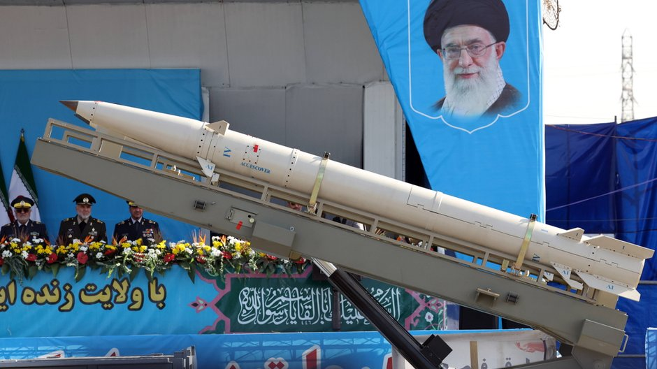 Ciężarówka z pociskiem przejeżdża obok zdjęcia Alego Chamenei, Najwyższego Przywódcy Iranu, podczas parady wojskowej