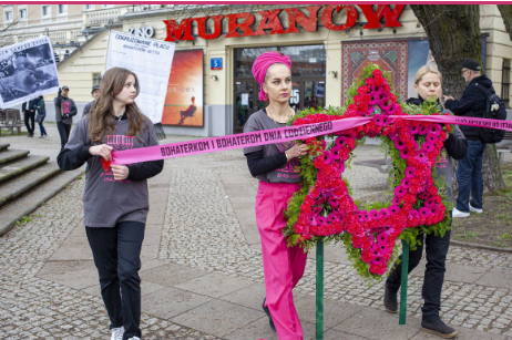 Działanie artystyczne Zuzanny Hertzberg (w środku) pt. 'Heroizm samego życia. Inna strona pomnika’ z okazji 80. rocznicy powstania w getcie warszawskim, 2023 r. (Fot. Jacek Wajszczak/REPORTER)
