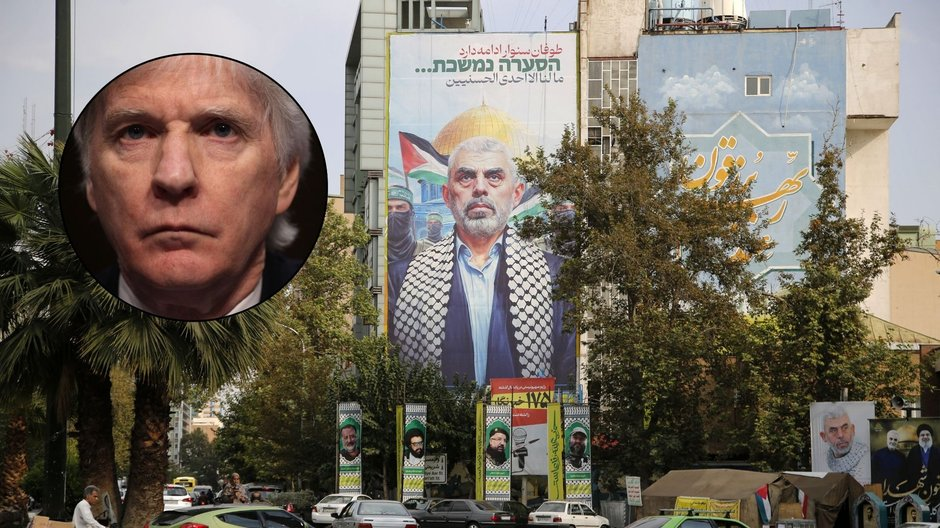 Billboard z Jahją Sinwarem w Teheranie, 19 października 2024 r. (w kółku: Ryan Crocker)