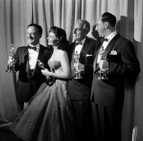 Reżyser Fred Zinnemann z aktorką Donną Reed, producentem Buddym Adlerem i scenarzystą Danielem Taradashem [1954]