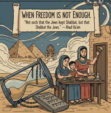 Jedną z charakterystycznych cech niewolnictwa jest utrata kontroli nad czasem; godziny niewolnika należą do kogoś innego. Według Tory wolność zaczyna się od odzyskania władzy nad czasem, jeszcze zanim nastąpi autonomia ruchu. Zanim Izraelici opuszczą Egipt, otrzymują polecenie, by żyć tak, jakby ich czas już należał do nich.