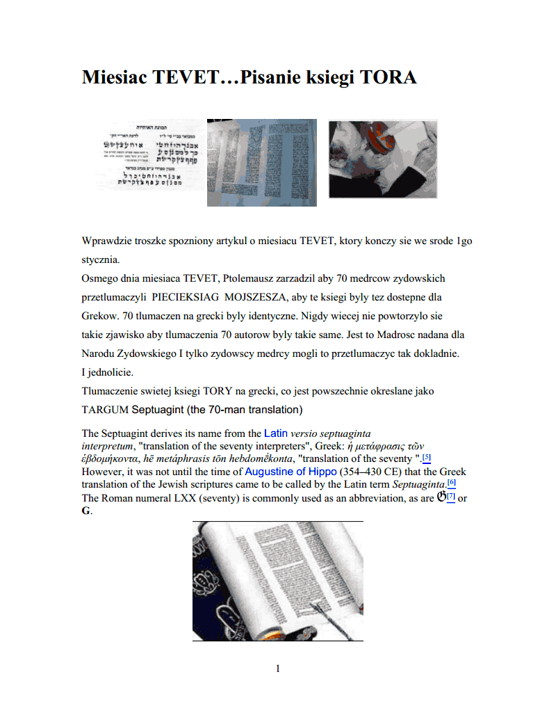 Nadeslala Zosia Braun Miesiac TEVET…Pisanie ksiegi TORA Wprawdzie troszke spozniony artykul o miesiacu TEVET, ktory konczy sie we srode 1go stycznia. Osmego dnia miesiaca TEVET, Ptolemausz zarzadzil aby 70 medrcow zydowskich przetlumaczyli […]